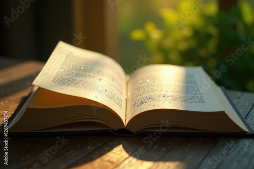 Morning dew glistens on the pages of an open book, book, wet, sunlight