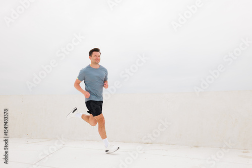 Morning jog at the seaside promenade captures a runner's determination against a backdrop of tranquil, overcast skies