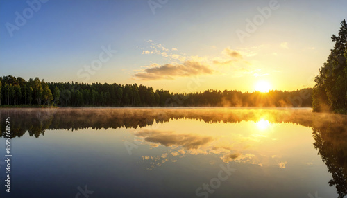 Morning lake with glowing horizon and soft fog above still water reflecting forest and sky, creating peaceful and warm natural landscape at sunrise