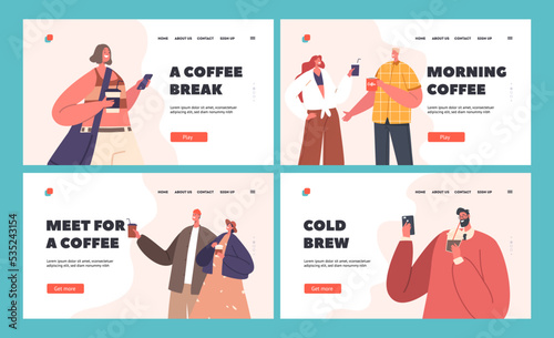 Morning Refreshment Landing Page Template Set. People Relaxing and Talking at Coffee Break Concept. Characters with Cups