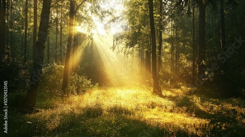 Morning sunlight filters through forest trees, illuminating the dew-kissed ground in a serene, golden glow