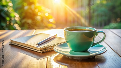 Morning sunlight shines on teal coffee cup and notebook creating a peaceful atmosphere , serene, cozy, introspective, calm