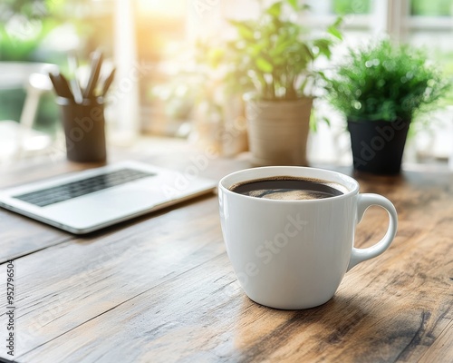 Morning workspace, warm coffee steaming beside an open laptop, sunlight filtering through a nearby window, inviting productivity and focus.