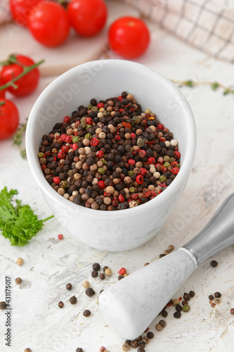 Mortar and pestle with peppercorns on light background