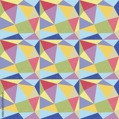 Mosaic geometric background. Funky, colorful vibe art, rainbow colors palette. Simple, clean, modern texture. Geometric, polygon style. Summer seamless pattern, playful texture. Triangles.