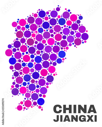 Mosaic Jiangxi Province map isolated on a white background. Vector geographic abstraction in pink and violet colors. Mosaic of Jiangxi Province map combined of scattered round points.