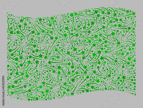 Mosaic waving green flag designed with petard star items. Vector fireworks mosaic waving green flag designed for event propaganda. Green flag collage is formed with randomized salute items.