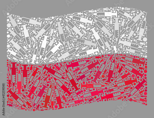 Mosaic waving Poland flag designed with syringe icons. Vector vaccine mosaic waving Poland flag done for epidemic advertisement. Poland flag collage is done of scattered vaccine items.