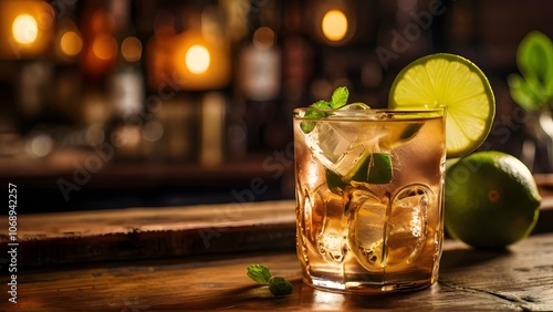 Moscow Mule Cocktail on the Bar Counter: Classic Vodka Drink with Ginger Beer and Lime