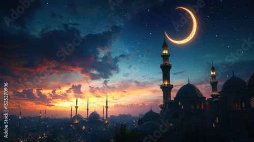 Mosque city at twilight, crescent moon
