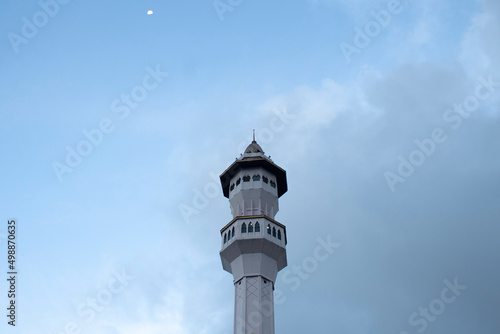 Mosque minaret and moon with clear sky
