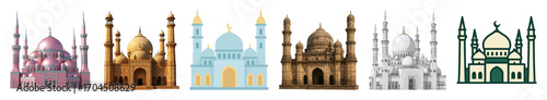 Mosque set including pink, gold, white, green, and blue designs isolated. Islamic architecture and celebration collection.