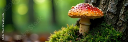 Moss-covered boletus edulis growing on a tree trunk, boletus edulis, nature