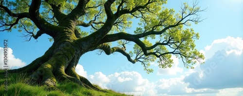 Moss-covered gnarled tree with branches stretching towards sky, branches, sky, woodland