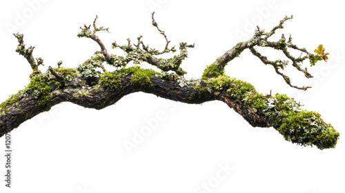 Moss-covered tree branch with intricate textures and details on a white isolated background.