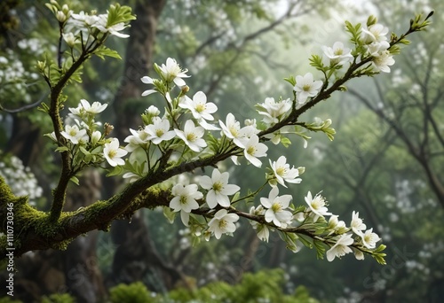 Mossy tree branch with white flowers and leaves, mossy branches, botanical art