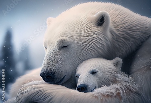 Mother and baby polar bear cuddling as family in snow in winter (Generative AI)