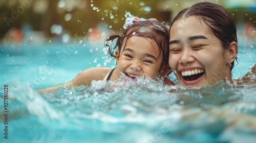 Mother and daughter sharing a joyful swim and splashing in the pool