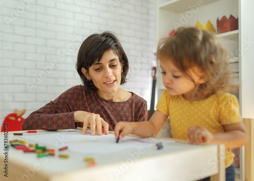 Mother and daughter sitting on the table and drawing. Learning with kids concept