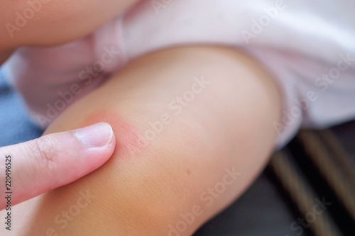 mother apply antiallergic cream at baby knee with skin rash and allergy with red spot cause by mosquito bite
