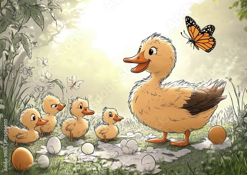 Mother Duck and Ducklings in Whimsical Cartoon Landscape with Butterfly and Broken Eggshells