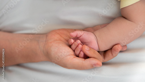 Mother holding baby hand and showing finger and fingernail on white sheet bed