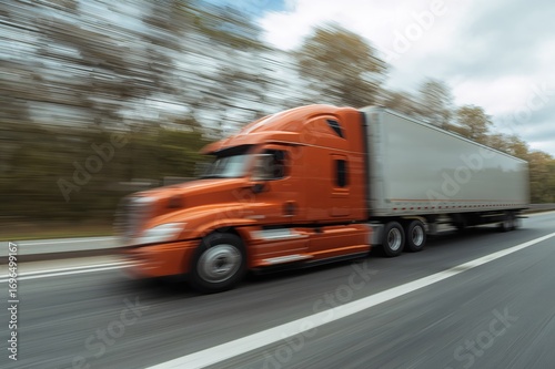 Motion blur effect of a speeding semi-truck on a road captured using a slow shutter technique.