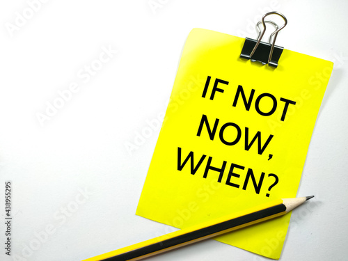 Motivated concept.Text IF NOT NOW,WHEN? on colorful paper note with pencil on white background.