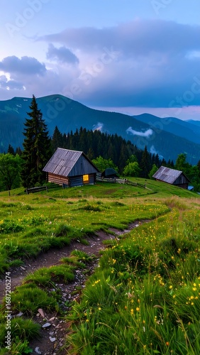 Mountain cabins at dusk, path leads to them