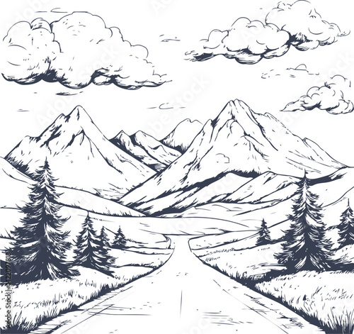 Mountain landscape sketch with winding road and fluffy clouds in black and white. Vector illustration