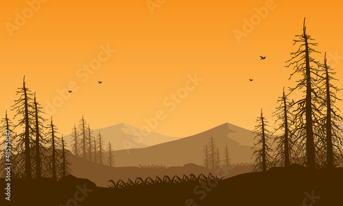 Mountain panorama from the edge of the forest at dusk with the silhouettes of dry fir trees around it