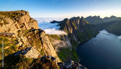 Mountain Peak Overlooking Water and Clouds in Scenic Landscape