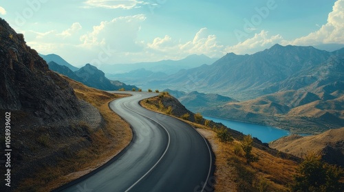 Mountain road on a sunny day, surrounded by breathtaking scenery. This stunning mountain road invites adventure, perfect for travel or outdoor-themed designs with ample copy space.