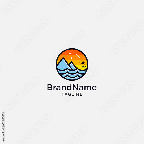 Mountain sunset beach logo concept. vector icon palm illustration