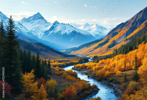 Mountainous landscape with a range of peaks in the distance, surrounded by a forested valley in the foreground with trees in autumn colors