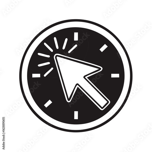 Mouse cursor clicking on a clock face representing fast digital action, quick online efficiency, and time management.
