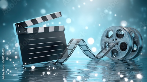 movie industry-themed background, featuring a classic film clapperboard in black and white with an icy blue-striped top.