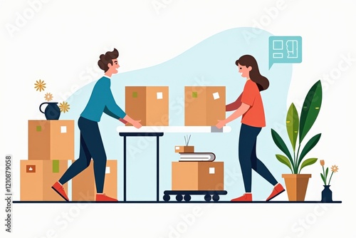 Moving Day: A Couple Collaborating to Transport Boxes and Packing Materials in a Cozy Home Environment with Plants and Decorations