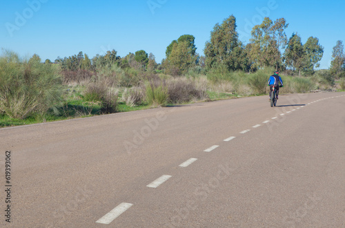 MTB Cyclist speeding down by local road. Vegas Altas irrigation channel roads