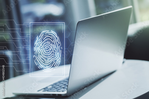 Multi exposure of abstract creative fingerprint illustration on modern laptop background, digital access concept