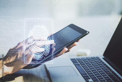 Multi exposure of abstract graphic fingerprint sketch and hand working with a digital tablet on background, fingerprint scan data concept
