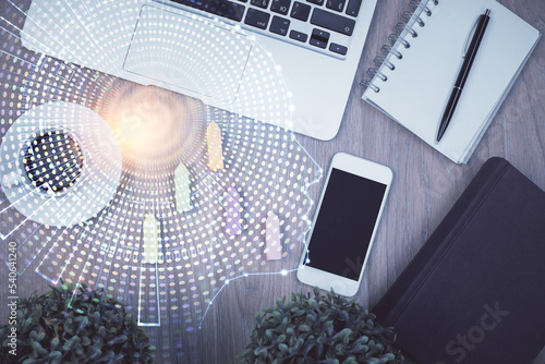 Multi exposure of brain drawing over work table desktop. Top view. Global data analysis concept.