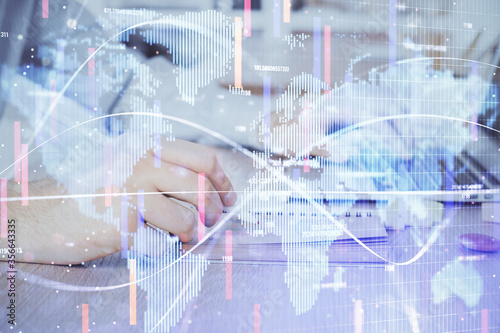 Multi exposure of businessman working on laptop on background. International business hologram in front. Concept of success.
