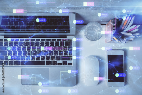 Multi exposure of data drawing hologram over topview of study desk background with computer. Concept of technology.