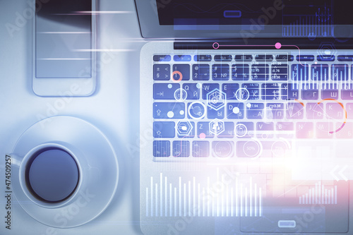 Multi exposure of data theme drawing hologram over topview work desk background with computer. Concept of technology.