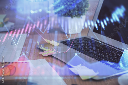 Multi exposure of forex chart and work space with computer. Concept of international online trading.