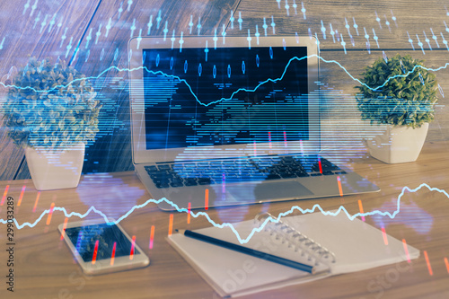 Multi exposure of forex graph and work space with computer. Concept of international online trading.