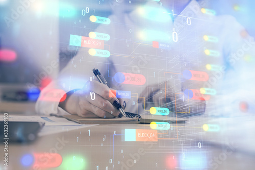 Multi exposure of hands making notes with digital coding icons. Computer learning concept.