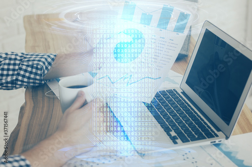 Multi exposure of technology hologram with man working on computer background. Concept of big data.