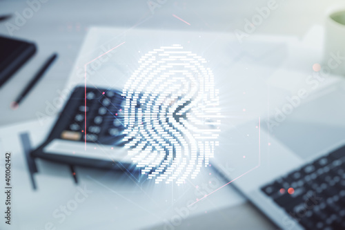 Multi exposure of virtual creative fingerprint hologram on blurry calculator with laptop background, personal biometric data concept